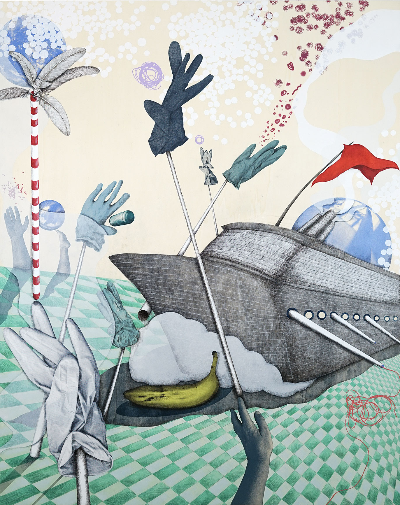 160 x 130 cm, Acryl, Siebdruck, Farbsdtifte und Tusche auf Holz