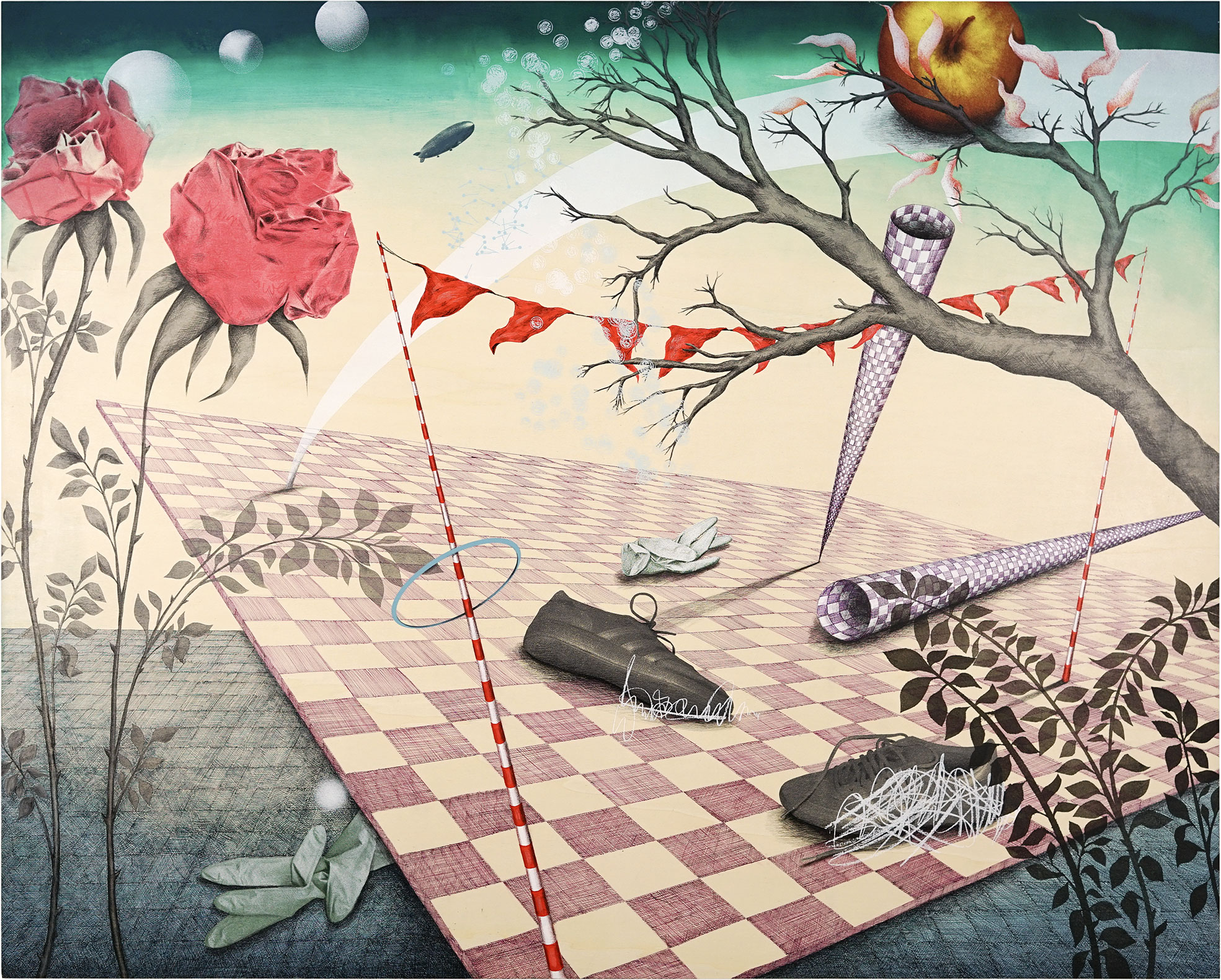 160 x 130 cm, Acryl, Ink, Pencil, Screenprinting on Wood